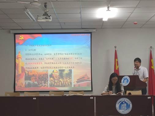 大会伊始,由陈文学院长带领全体党员了解党的历史,学习党的精神,陈文学院长从鸦片战争、太平天国、辛亥革命、俄国十月革命、五四运动几个方面讲述中国共产党成立的历史条件,带领全体党员回顾了中国共产党的成立。