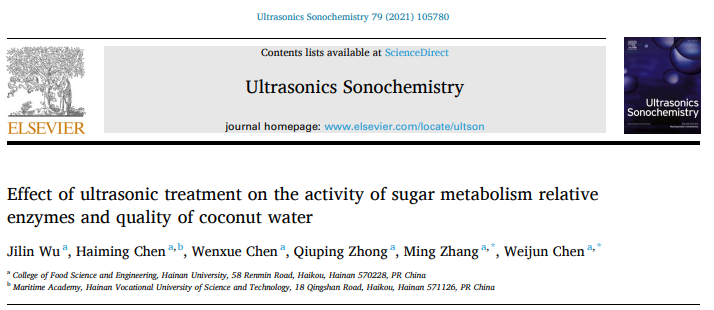 近日,yl7703永利陈卫军研究员课题组利用超声技术延长椰青贮存时间并保持椰子水的甜度,研究成果发表在《Ultrasonics Sonochemistry》(中科院1区TOP期刊,影响因子7.491),题为“Effect of Ultrasonic Treatment on the Activity of Sugar Metabolism Relative Enzymes and Quality of Coconut Water”,相关技术已申请专利《变温超声耦合密闭流体局部压差(UCP)灭酶处理的椰青保存方法》(申请号:CN202010102300.6)。