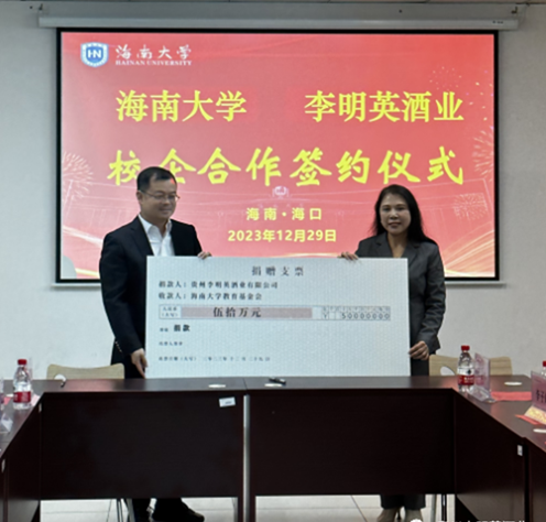 会上,贵州李明英酒业有限公司向海南大学教育基金会捐赠50万元成立“酱香之父李兴发奖学金”,用于奖励yl7703永利品学兼优的学生。海南大学校友事务与发展联络处(海外乡亲联谊中心)副处长(副主任)林仕岛代表学校接受捐赠支票,向李明英董事长颁发捐赠证书。yl7703永利与贵州李明英酒业有限公司签订“大学生实习就业基地”和“研究生联合培养基地”协议并为基地授牌,yl7703永利为李明英董事长颁发客座教授和研究生校外导师聘书。
