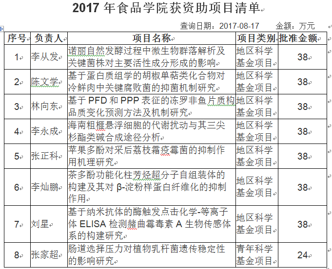 2017年8月17日传来捷报,2017年海南大学共有79个项目获得国家自然科学基金资助,其中食品学院有8项,其中地区科学基金项目7项,青年科学基金项目1项。获资助项目情况如下表所示://www.hainanu.edu.cn